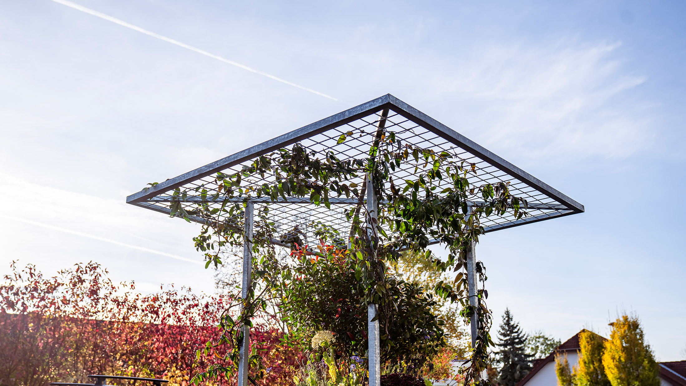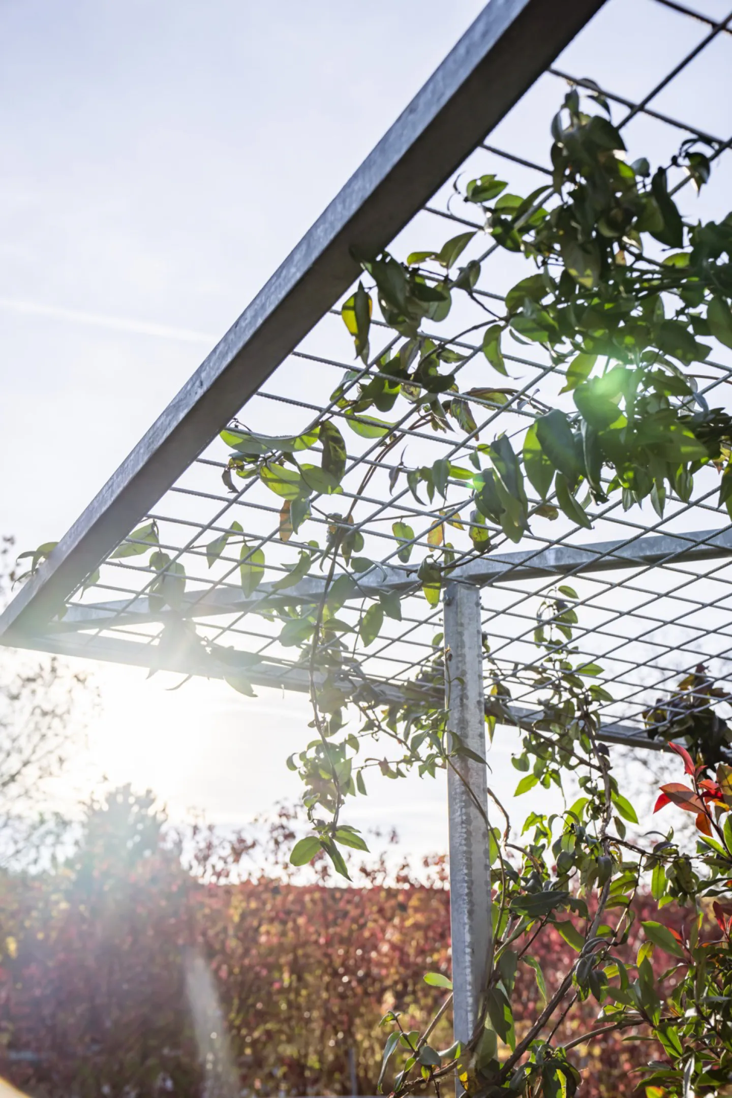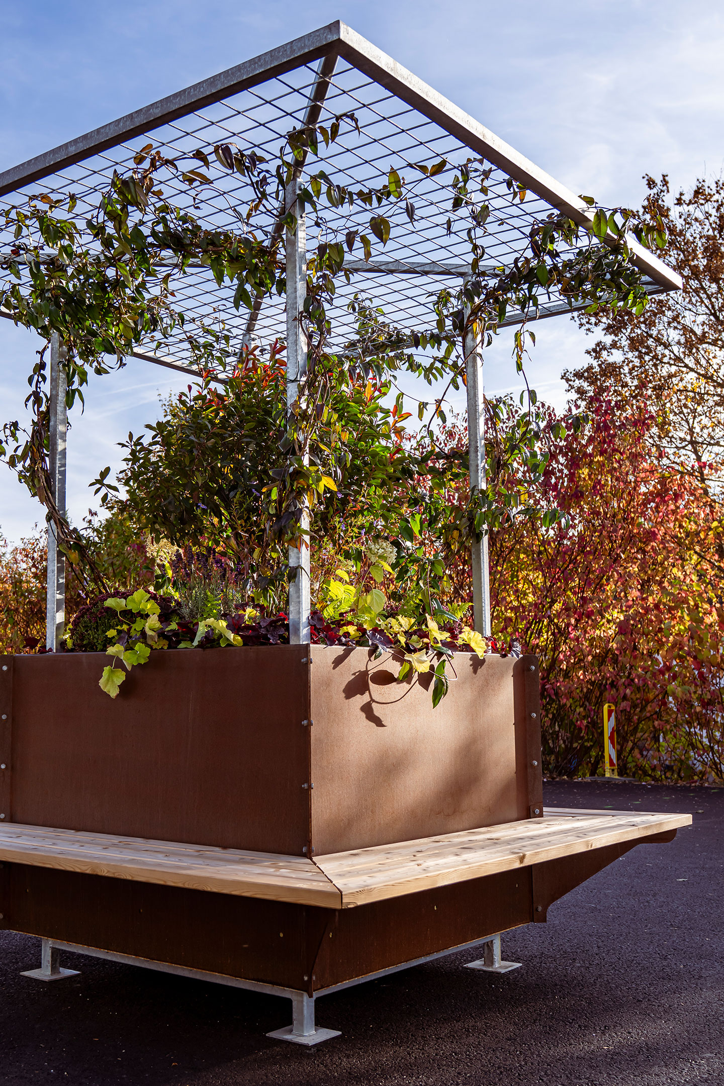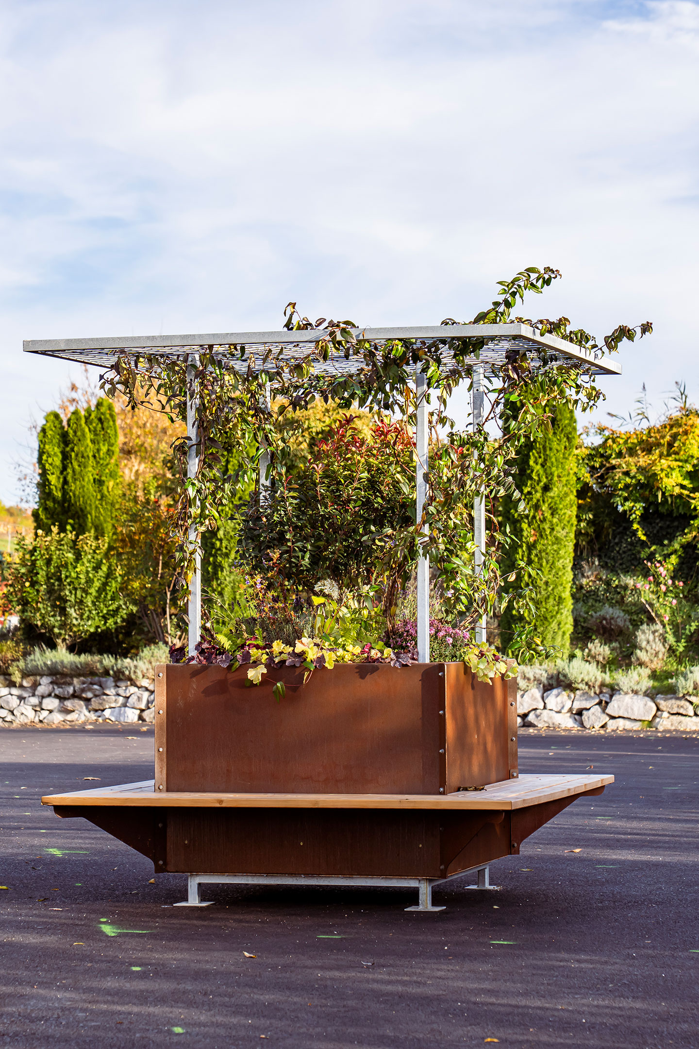 Angenehmer kühler Raum. Für Ortskerne, Terrassen, Innenhöfe, Pausenbereiche oder Gästezonen. Die Pflanzen sorgen für natürliche, spürbare Abkühlung – besonders an heißen Tagen.